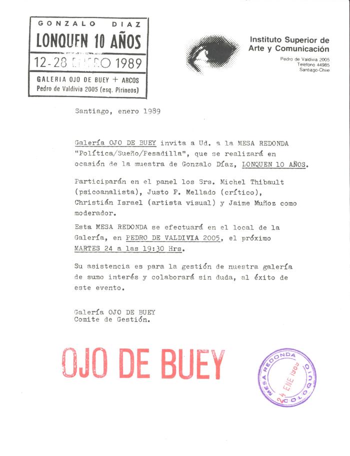 Transcripción de la Mesa Redonda Política, Sueño, Pesadilla relaizada el 24 de enero de 1989 en la galería Ojo de Buey con ocasión de la muestra de Gonzalo Díaz Lonquén 10 años